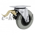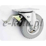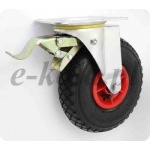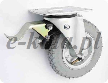 Koła pneumatyczne w obudowie skrętnej z hamulcem składają się z koła pneumatyczne z tworzywową lub metalową felgą oraz ze stabilnej stalowej obudowy tłoczonej z płytką mocującą oraz hamulcem mechanicznym bądź obudowy spawanej. Koło występujące w tej obudowie osadzone jest na tulejce, montowane jest z kielichem obudowy za pomocą śruby i nakrętki. Precyzyjne wykonanie obudowy skrętnej z płytką mocującą umożliwia obracanie zestawu skrętnego w pionie oraz dowolne manewry maszynami, środkami transportowymi itd. Specjalna budowa pozwala na łatwe skręcanie zestawem bez dodatkowych sił i środków pomocniczych oraz zachowanie stabilnego kierunku ruchu w linii prostej. Obudowa skrętna wyposażona jest dodatkowo w hamulec mechaniczny za pomocą którego możliwa jest blokada ruchu obrotowego koła, ruchu obrotowego głowicy skrętnej a także blokada kierunku.