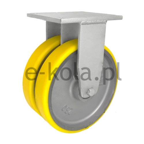 Koła żeliwno-poliuretanowe w obudowach typu tandem do dużych obciążeń w obudowie stałej firmy ZABI w zestawie dostępne są z dwoma kołami z jednolitego, obrabianego maszynowo korpusu z odlewu żeliwnego z trwale połączonym bieżnikiem poliuretanowym oraz ze stabilnej stalowej obudowy spawanej o specjalnej konstrukcji typu tandem. Koło występujące w tej obudowie osadzone jest na tulejce, montowane jest z kielichem obudowy za pomocą śruby i nakrętki. Zestawy kołowe stałe nie obracają się. Takiego typu obudowa zapewnia urządzeniom stabilność kierunku w linii prostej. Koła są od siebie oddzielone dodatkową przegrodą.