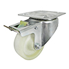Koła i kółka tworzywowe odporne na wysoką temperaturę w obudowie skrętnej składają się koła o jednolitym korpusie wykonanym wtryskowo z poliamidu PA 66 oraz ze stabilnej stalowej obudowy tłoczonej z płytką mocującą oraz hamulcem mechanicznym. Koło występujące w tej obudowie osadzone i montowane jest z kielichem obudowy za pomocą nitu. Precyzyjne wykonanie obudowy skrętnej z płytką mocującą umożliwia obracanie zestawu skrętnego w pionie oraz dowolne manewry maszynami, środkami transportowymi itd. Specjalna budowa pozwala na łatwe skręcanie zestawem bez dodatkowych sił i środków pomocniczych oraz zachowanie stabilnego kierunku ruchu w linii prostej. Obudowa skrętna wyposażona jest dodatkowo w hamulec za pomocą którego możliwa jest blokada ruchu obrotowego koła, ruchu obrotowego głowicy skrętnej a także blokada kierunku. Koła wykonane z poliamidu PA 66 zawierają 30% włókna szklanego, co wpływa na jego stabilizację termiczną, zapewnia wysoką odporność cieplną. Koła te występuje również w kolorze czarnym. Dostępne jest z łożyskiem ślizgowym. Koła i kółka tworzywowe odporne na wysoką temperaturę charakteryzują się wysoką odpornością na ścieranie oraz na temperaturę od -40 do +130°C.
