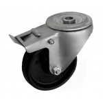 Koła tworzywowe w obudowie z otworem i hamulcem na śrubę mocującą składają się z koła, w zależności od wyboru, oraz ze stabilnej stalowej obudowy tłoczonej z płytką mocującą. Koło występujące w tej obudowie osadzone jest na tulejce, montowane jest z kielichem obudowy za pomocą śruby i nakrętki. Precyzyjne wykonanie obudowy umożliwia obracanie zestawu w pionie oraz dowolne manewry maszynami, środkami transportowymi itd. Specjalna budowa pozwala na łatwe skręcanie zestawem bez dodatkowych sił i środków pomocniczych oraz zachowanie stabilnego kierunku ruchu w linii prostej. Obudowy kół tłoczone są z wysokiej jakości stali nierdzewnej.