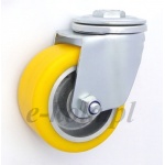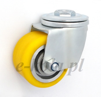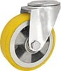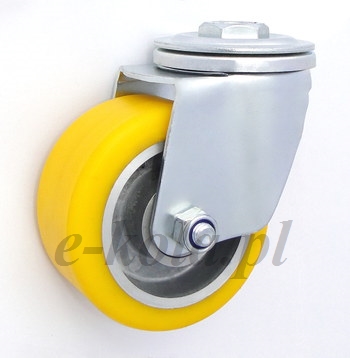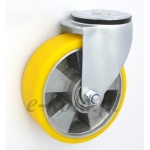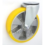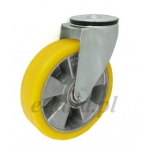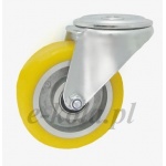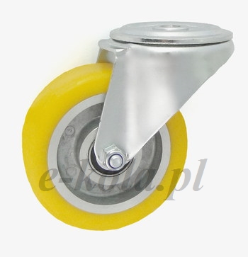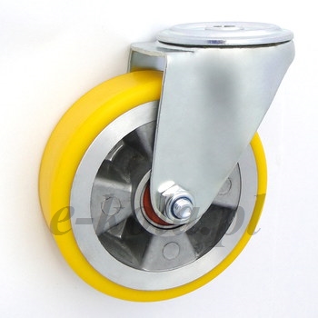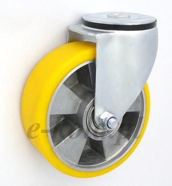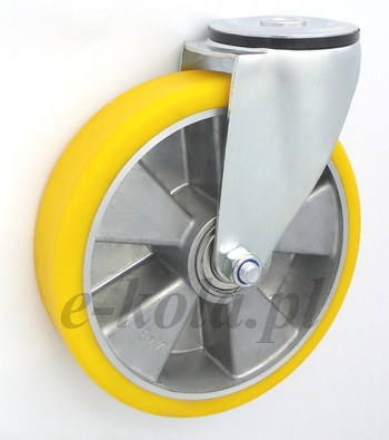 Koła aluminiowo-poliuretanowe w obudowie z otworem składają się z koła z aluminiowego korpusu z trwale połączonym bieżnikiem poliuretanowym oraz ze stabilnej stalowej obudowy tłoczonej z centralnym otworem na śrubę mocującą. Koło występujące w tej obudowie osadzone jest na tulejce, montowane jest z kielichem obudowy za pomocą śruby i nakrętki. Precyzyjne wykonanie obudowy skrętnej umożliwia obracanie zestawu skrętnego w pionie oraz dowolne manewry maszynami, środkami transportowymi itd. Specjalna budowa pozwala na łatwe skręcanie zestawem bez dodatkowych sił i środków pomocniczych oraz zachowanie stabilnego kierunku ruchu w linii prostej. Koła i kółka aluminiowo-poliuretanowe charakteryzują się dużą wytrzymałością na obciążenia. Koła są niewrażliwe na zabarwienia. Cichobieżne absorbują drgania i uderzenia. Wyróżniają się niskim oporem toczenia. Koła i kółka aluminiowo poliuretanowe można stosować w temperaturach od -20°C do +70°C. Twardość bieżnika standardowego koła to 92°Shore’a. Koła i zestawy kołowo aluminiowo-poliuretanowe dostępne są z łożyskami kulkowymi.