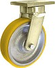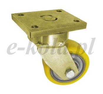 Koła i zestawy kołowe żeliwno-poliuretanowe do dużych obciążeń w obudowie skrętnej składają się z koła jednolitego, obrabianego maszynowo korpusu z odlewu żeliwnego z trwale połączonym bieżnikiem poliuretanowym oraz ze stabilnej stalowej obudowy spawanej. Koło występujące w tej obudowie osadzone jest na tulejce, montowane jest z kielichem obudowy za pomocą śruby i nakrętki. Precyzyjne wykonanie obudowy skrętnej z płytką mocującą umożliwia obracanie zestawu skrętnego w pionie oraz dowolne manewry maszynami, środkami transportowymi itd. Specjalna budowa pozwala na łatwe skręcanie zestawem bez dodatkowych sił i środków pomocniczych oraz zachowanie stabilnego kierunku ruchu w linii prostej.