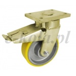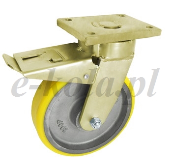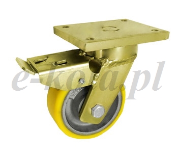 Koła i zestawy kołowe żeliwno-poliuretanowe w obudowie skrętnej z hamulcem składają się z koła jednolitego, obrabianego maszynowo korpusu z odlewu żeliwnego z trwale połączonym bieżnikiem poliuretanowym oraz ze stabilnej stalowej spawanej obudowy z hamulcem mechanicznym. Koło występujące w tej obudowie osadzone jest na tulejce, montowane jest z kielichem obudowy za pomocą śruby i nakrętki. Precyzyjne wykonanie obudowy skrętnej z płytką mocującą umożliwia obracanie zestawu skrętnego w pionie oraz dowolne manewry maszynami, środkami transportowymi itd. Specjalna budowa pozwala na łatwe skręcanie zestawem bez dodatkowych sił i środków pomocniczych oraz zachowanie stabilnego kierunku ruchu w linii prostej. Obudowa skrętna wyposażona jest dodatkowo w hamulec mechaniczny za pomocą którego możliwa jest blokada ruchu obrotowego koła, ruchu obrotowego głowicy skrętnej a także blokada kierunku.