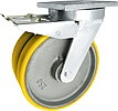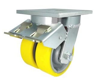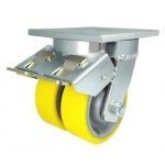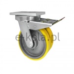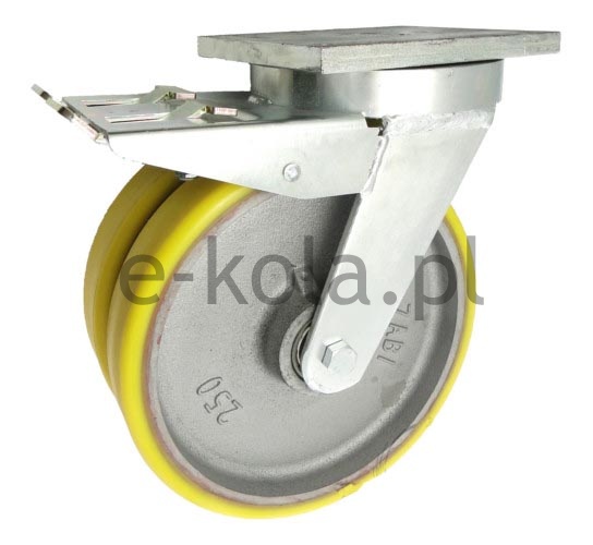 Koła żeliwno-poliuretanowe w obudowach typu tandem do dużych obciążeń w obudowie skrętnej z hamulcem w zestawie dostępne są z dwoma kołami z jednolitego, obrabianego maszynowo korpusu z odlewu żeliwnego z trwale połączonym bieżnikiem poliuretanowym oraz ze stabilnej stalowej spawanej obudowy z hamulcem mechanicznym o specjalnej konstrukcji typu tandem. Koła występujące w tej obudowie osadzone są na tulejkach, montowane jest z kielichem obudowy za pomocą specjalnej śruby i nakrętki. Precyzyjne wykonanie obudowy skrętnej z płytką mocującą umożliwia obracanie zestawu skrętnego w pionie oraz dowolne manewry maszynami, środkami transportowymi itd. Specjalna budowa pozwala na łatwe skręcanie zestawem bez dodatkowych sił i środków pomocniczych oraz zachowanie stabilnego kierunku ruchu w linii prostej. Całość jest połączona wspawanym sworzniem centralnym wraz z łożyskiem stożkowym w głowicy skrętnej. Koła są od siebie oddzielone dodatkową przegrodą. Obudowa skrętna wyposażona jest dodatkowo w hamulec mechaniczny za pomocą którego możliwa jest blokada ruchu obrotowego koła, ruchu obrotowego głowicy skrętnej a także blokada kierunku.