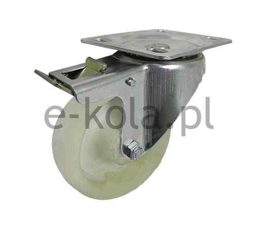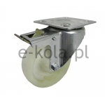 Koła i kółka tworzywowe odporne na wysoką temperaturę w obudowie skrętnej składają się koła o jednolitym korpusie wykonanym wtryskowo z poliamidu PA 66 oraz ze stabilnej stalowej obudowy tłoczonej z płytką mocującą oraz hamulcem mechanicznym. Koło występujące w tej obudowie osadzone i montowane jest z kielichem obudowy za pomocą nitu. Precyzyjne wykonanie obudowy skrętnej z płytką mocującą umożliwia obracanie zestawu skrętnego w pionie oraz dowolne manewry maszynami, środkami transportowymi itd. Specjalna budowa pozwala na łatwe skręcanie zestawem bez dodatkowych sił i środków pomocniczych oraz zachowanie stabilnego kierunku ruchu w linii prostej. Obudowa skrętna wyposażona jest dodatkowo w hamulec za pomocą którego możliwa jest blokada ruchu obrotowego koła, ruchu obrotowego głowicy skrętnej a także blokada kierunku. Koła wykonane z poliamidu PA 66 zawierają 30% włókna szklanego, co wpływa na jego stabilizację termiczną, zapewnia wysoką odporność cieplną. Koła te występuje również w kolorze czarnym. Dostępne jest z łożyskiem ślizgowym. Koła i kółka tworzywowe odporne na wysoką temperaturę charakteryzują się wysoką odpornością na ścieranie oraz na temperaturę od -40 do +130°C.