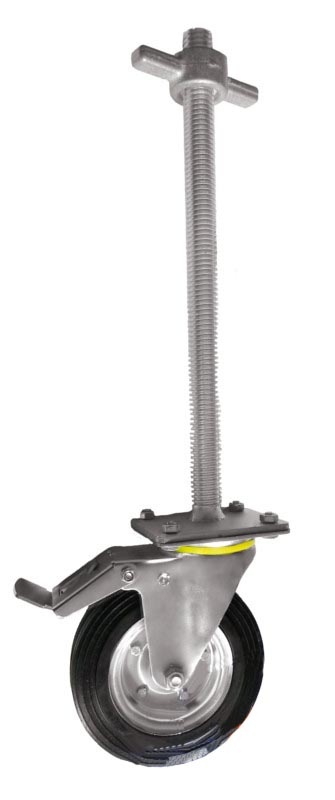 Koła i zestawy kołowe do rusztowań z regulacją wysokości składają się z podstawy śrubowej do rusztowań o długości 400mm lub 500mm oraz koła metalowo-gumowego w obudowie skrętnej. Podstawa do rusztowania posiada gwintowy trzpień o średnicy Ø26, Ø32, Ø42, nakrętką i gniazdem na rurę ramy stalowej. Zagnieciony gwint zabezpiecza przed wykręceniem nakrętki. Podstawy mają przewiercone otwory co umożliwia przykręcenie ich do kół Ø160mm lub Ø200mm dostępnych w naszym sklepie w obudowie skrętnej z hamulcem, który blokuje koło i głowicę skrętną za pomocą bardzo mocnego mechanizmu.