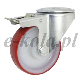 Koła poliamdowo-poliuretanowe w obudowie z otworem i hamulcem składają się z koła z uformowanego bieżnika poliuretanowego nałożonego na stałe na poliamidowym korpusie oraz ze stabilnej stalowej obudowy tłoczonej z centralnym otworem na śrubę mocującą. Koło występujące w tej obudowie osadzone jest na tulejce, montowane jest z kielichem obudowy za pomocą śruby i nakrętki. Precyzyjne wykonanie obudowy skrętnej umożliwia obracanie zestawu skrętnego w pionie oraz dowolne manewry maszynami, środkami transportowymi itd. Specjalna budowa pozwala na łatwe skręcanie zestawem bez dodatkowych sił i środków pomocniczych oraz zachowanie stabilnego kierunku ruchu w linii prostej.