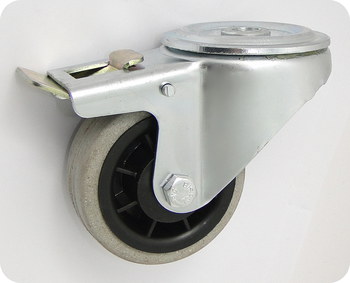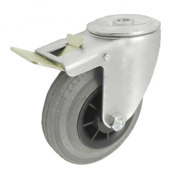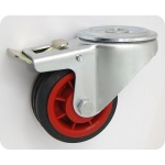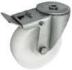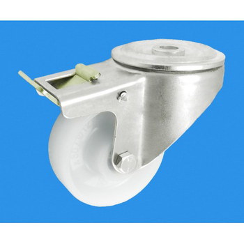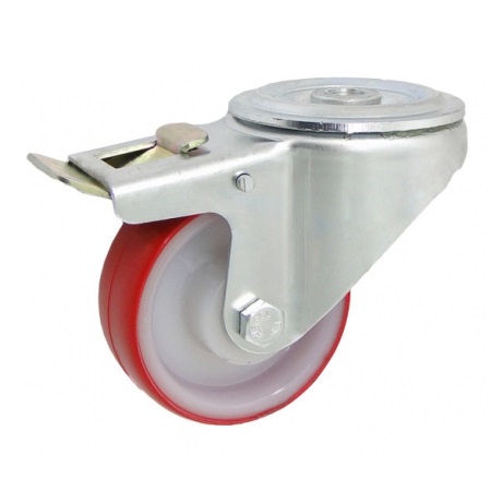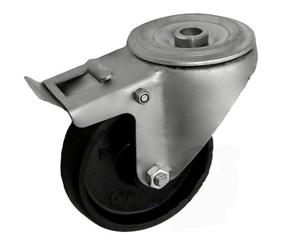 Koła tworzywowe w obudowie z otworem i hamulcem na śrubę mocującą składają się z koła, w zależności od wyboru, oraz ze stabilnej stalowej obudowy tłoczonej z płytką mocującą. Koło występujące w tej obudowie osadzone jest na tulejce, montowane jest z kielichem obudowy za pomocą śruby i nakrętki. Precyzyjne wykonanie obudowy umożliwia obracanie zestawu w pionie oraz dowolne manewry maszynami, środkami transportowymi itd. Specjalna budowa pozwala na łatwe skręcanie zestawem bez dodatkowych sił i środków pomocniczych oraz zachowanie stabilnego kierunku ruchu w linii prostej. Obudowy kół tłoczone są z wysokiej jakości stali nierdzewnej.