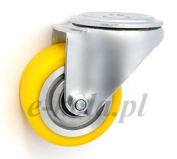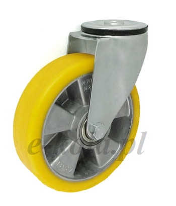 Koła aluminiowo-poliuretanowe w obudowie z otworem składają się z koła z aluminiowego korpusu z trwale połączonym bieżnikiem poliuretanowym oraz ze stabilnej stalowej obudowy tłoczonej z centralnym otworem na śrubę mocującą. Koło występujące w tej obudowie osadzone jest na tulejce, montowane jest z kielichem obudowy za pomocą śruby i nakrętki. Precyzyjne wykonanie obudowy skrętnej umożliwia obracanie zestawu skrętnego w pionie oraz dowolne manewry maszynami, środkami transportowymi itd. Specjalna budowa pozwala na łatwe skręcanie zestawem bez dodatkowych sił i środków pomocniczych oraz zachowanie stabilnego kierunku ruchu w linii prostej. Koła i kółka aluminiowo-poliuretanowe charakteryzują się dużą wytrzymałością na obciążenia. Koła są niewrażliwe na zabarwienia. Cichobieżne absorbują drgania i uderzenia. Wyróżniają się niskim oporem toczenia. Koła i kółka aluminiowo poliuretanowe można stosować w temperaturach od -20°C do +70°C. Twardość bieżnika standardowego koła to 92°Shore’a. Koła i zestawy kołowo aluminiowo-poliuretanowe dostępne są z łożyskami kulkowymi.