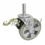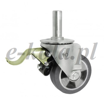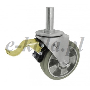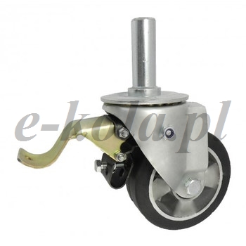 Koła aluminiowo-gumowe w obudowie z trzpieniem i hamulcem składają się z koła składające się z aluminiowego korpusu trwale połączonego z oponą z pełnej gumy oraz ze stabilnej stalowej obudowy tłoczonej z trzpieniem wraz z hamulcem mechanicznym. Koło występujące w tej obudowie osadzone jest na tulejce, montowane jest z kielichem obudowy za pomocą śruby i nakrętki. Precyzyjne wykonanie obudowy skrętnej umożliwia obracanie zestawu skrętnego w pionie oraz dowolne manewry maszynami, środkami transportowymi itd. Specjalna budowa pozwala na łatwe skręcanie zestawem bez dodatkowych sił i środków pomocniczych oraz zachowanie stabilnego kierunku ruchu w linii prostej.